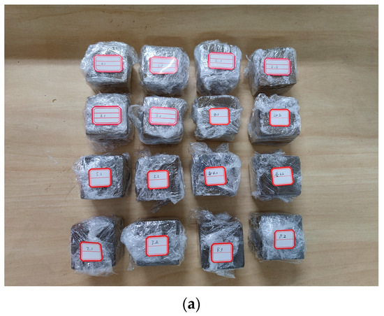 The specimens were placed on a cling film, and six faces of the specimens were continuously and randomly sprayed with pure water using a capillary nozzle. Nine groups of rammed–earth specimens with moisture content ranging from 0% to 16% (moisture content gradient of 2%) were prepared separately [25]. As shown in Figure 3, after spraying the specimen with water, it was immediately wrapped with plastic wrap. The specimen was weighed after standing for 24 h; if the quality of the specimen did not meet the experimental requirements, then the above steps were repeated until the specimen had sufficiently absorbed water to reach the target moisture content. The test method was the transient planar heat source method, with a DRE-2C thermal conductivity tester (measurement range 0.01–100 W/(m·K), accuracy: ≤±5%), under an experimental environment of 20 ± 2 °C. Each group of specimens was tested thrice, and the results were averaged.