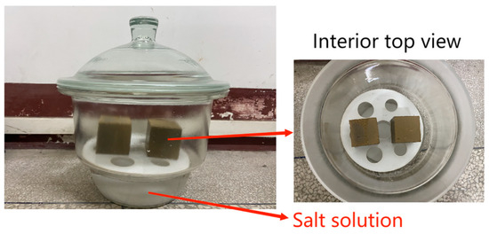 Isothermal moisture absorption and discharge curves were plotted based on the equilibrium moisture content obtained in isothermal environments with different relative humidities. The moisture absorption and discharge capacities of the rammed–earth materials were obtained by studying their isothermal moisture absorption and discharge curves. The experiment was conducted using the desiccator method, and the indoor experimental environment was maintained at 25 ± 1 °C and 60 ± 1% relative humidity [22,23,24]. The specific experimental steps were as follows: (1) The square rammed-earth specimen was placed into the blast–drying oven at a temperature of 105 °C for 24 h, continuously (specimens intact after drying), and when the change in specimen quality was not more than 0.1%, the specimen was considered completely dry. (2) After the specimens were cooled, they were placed sequentially on partitions in drying dishes containing saturated salt solutions with low to high relative humidities for the experiments, as shown in Figure 4. The corresponding relative values of the saturated salt solutions are listed in Table 1. (3) Every 24 h, the test piece was weighed, and two consecutive weights were measured. If the mass difference was less than 0.1%, then the test piece was considered to have reached equilibrium moisture absorption. (4) The rammed–earth specimens that reached moisture absorption equilibrium were then placed in drying dishes with high to low relative humidities to conduct the moisture release process. (5) The equilibrium moisture content was calculated as follows: