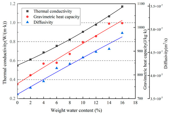 For the same substance, the material structure, density, temperature, humidity, and pressure affect the thermal conductivity [27]. In general, solids have the highest thermal conductivities among solids, liquids, and gases, followed by liquids and gases. This is because the molecular spacings between the different states are different; thus, their thermal conductivities vary. The lower the water content and temperature of the same substance, the lower its thermal conductivity.