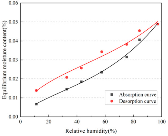 As shown in Figure 6, the isothermal moisture absorption and discharge curves were obtained as functions of the relative humidity by fitting a nonlinear curve according to Equation (6).
