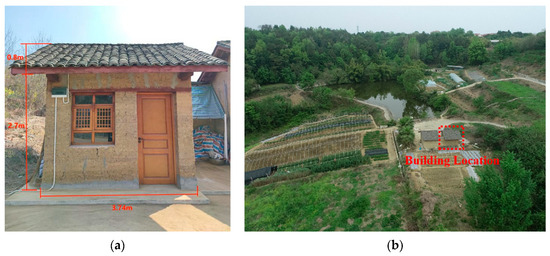 To study the coupled heat and humidity transfer process and the indoor heat and humidity environment of the rammed–earth building envelope, the temperature and humidity were measured. The experiment was a year–round uninterrupted test. The test data from 11 August to 17 August and 1 December to 7 December 2022 were selected for the analysis and research in this paper, with the summer period having a local extreme high–temperature climate of 1 in 60 years. During the experiment, the doors and windows were closed, and there was no ventilation, indoor heat source, or moisture source. The experimental building is located at Southwest University of Science and Technology, Mianyang (104.56 E, 31.53 W), Sichuan Province. It was constructed using the slab–on–wall construction method, completed in August 2021, and is only used for experiments without human habitation. From the interior floor to the highest point of the sloped roof is 3.5 m, and to the eaves is 2.7 m. The room width is 3 m, depth is 4 m, and wall thickness is 0.37 m, as shown in Figure 7a.