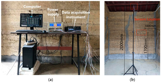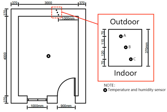 The test system provided real–time measurements of the indoor temperature and humidity in the buildings, internal temperature, humidity in walls, outdoor temperature and humidity, and solar radiation on the north side of the building. The experiments were conducted by collecting, recording, and storing temperature and humidity data using a Keysight-DAQ970A data acquisition instrument at a recording interval of 10 min. Temperature data were measured using a K-type thermocouple (temperature range: 0–1300 °C, accuracy: ±0.5 °C), humidity data were measured by a Honeywell capacitive humidity sensor (HIH-4000-003, accuracy: ±3.5%), and the humidity sensor was connected to a 5 V DC power supply. Solar radiation was measured by a JTR05 type solar radiation sensor (spectral range: 0.3–3.2 μm, accuracy: ≤±2%). The internal wall temperature and humidity sensors were arranged in a perforated manner at 1.7 m high and 1 m from the corner of the north wall, with the arrangement direction perpendicular to the wall, and the arrangement depths were 0.07 m(C), 0.19 m(B), and 0.30 m(A) from the internal surface of the wall, as shown in Figure 8. The indoor temperature and humidity sensors were placed at the center at a height of 2 m, as shown in Figure 9. The outdoor temperature and humidity sensors were arranged in a louvered box that was approximately 2 m away from the north side of the exterior wall and approximately 1 m high. The solar radiation meter was placed at an unobstructed location directly in front of the building.