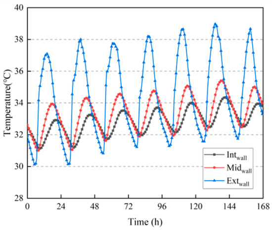 Figure 10 shows the temperature change inside the wall, where the temperature of the outer surface of the wall fluctuated significantly. During daytime solar irradiation, the highest temperature of the outer surface was close to 40 °C, while at night, when there was no sunlight, the lowest temperature dropped to below 32 °C. It can be observed from Figure 10 that the daily temperature fluctuation of the outer surface of the wall was approximately 7.5 °C. The temperature fluctuations in the middle and inner surfaces of the walls were relatively smooth, with daily temperature fluctuations of approximately 3 °C and 1.5 °C, respectively. As listed in Table 2, the daily average temperature of the inner surface of the wall was the lowest in all cases, whereas the temperature fluctuated widely on the outer surface of the wall. The daily average temperature of the outer surface of the wall was the highest in all cases, indicating that the rammed earth had a certain heat–buffering capacity [31,32].