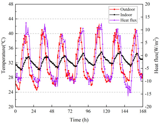 Figure 11 shows the heat flux and indoor and outdoor temperatures of the internal surface of the wall. The heat flux calculation resulted in positive values, indicating that the wall absorbed heat, whereas negative values indicate that the wall exerted heat. As shown in Figure 11, during the day, when the temperature increased, the inner surface of the wall absorbed the heat from the indoor air. At night, the outdoor temperature was lower than the indoor temperature, and the wall transmitted the stored heat indoors. This spontaneous heat transfer can effectively regulate indoor temperature, reduce the need for air conditioning, and achieve the purpose of saving energy. Within 7 d of the test, the total heat absorption by the inner surface of the wall was 839.39 W/m2 and the total heat release was 1656.46 W/m2.