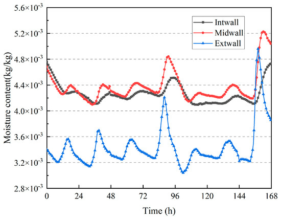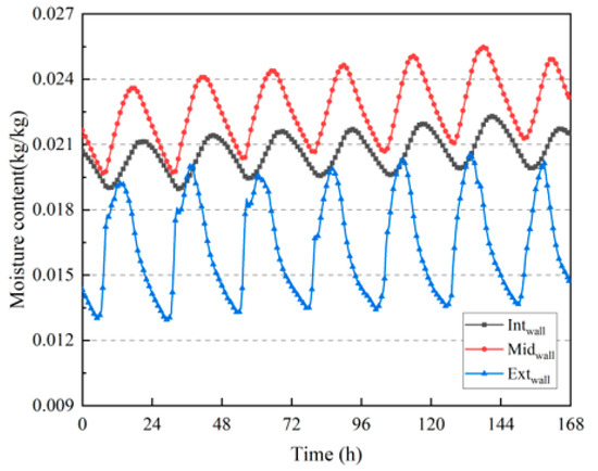 The building was built in only one year, and a large amount of moisture was retained inside the wall; therefore, the moisture content was highest in the middle of the wall. According to Figure 10 and Figure 12, the larger the temperature fluctuation, the greater the moisture content fluctuation at the corresponding position inside the wall.