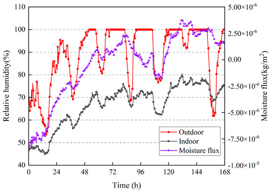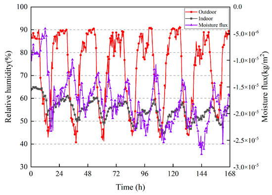 Figure 13 shows the moisture flux calculation results and the indoor and outdoor relative humidities during the actual measurement period. If the calculation result is positive, then the wall absorbs moisture; otherwise, the wall dissipates moisture. Owing to the short building construction time, the moisture content of the wall was high, and the test period experienced a continuous high temperature without rainfall. During the 7 d of the test, the wall continued to release moisture into the room, and the total moisture dissipation was 0.00586 kg/m2.