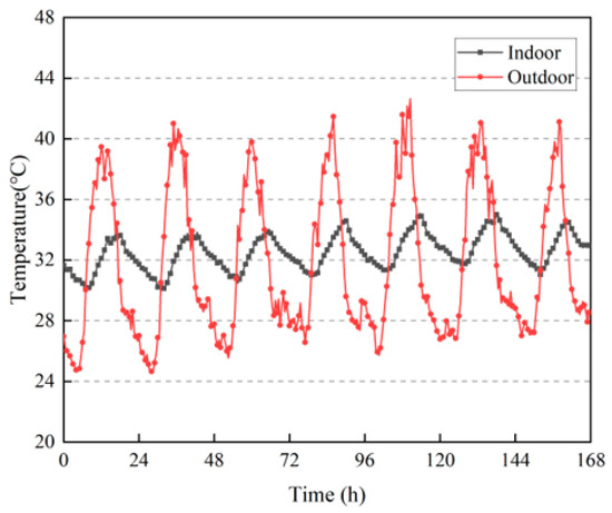 The test data from 00:00 on 11 August to 24:00 on 17 August in summer were selected for research, which all had typical summer high–temperature weather, and the test period consisted of continuous sunny days with no rainfall. To avoid affecting the test environment during the test, there was no heat or humidity source in the building.