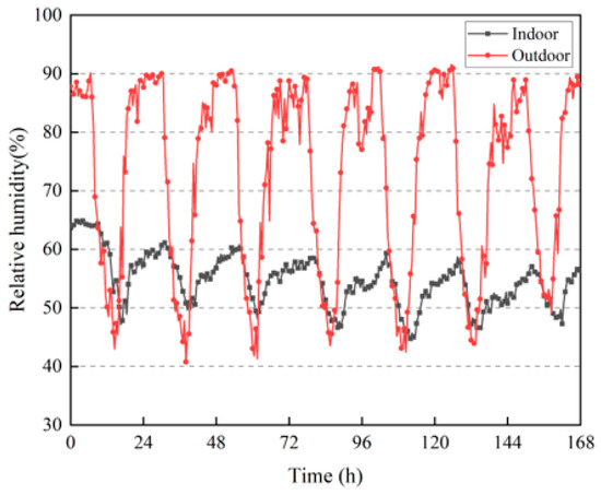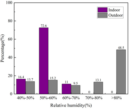Indoor relative humidity is an important reference index for comfort in a living environment. As shown in Figure 15, the outdoor relative humidity fluctuated greatly, and during the daytime sunshine period, the lowest outdoor relative humidity was between 40% and 50%, owing to the high outdoor temperature and fast evaporation rate of moisture. At night, the relative humidity reached approximately 90%. This is because the building is located on the hillside, where vegetation covers a large area, and there is a large body of water near the building (there is a pond directly in front of the building), as shown in Figure 7b. When the air temperature decreases at night, the vegetation and body of water keeps dispersing moisture into the air, and the water vapor in the air at night is more likely to coalesce. Compared with the outdoor humidity, the indoor relative humidity fluctuated more smoothly, with the relative humidity fluctuating between 40% and 70%. The proportion of indoor and outdoor relative humidity periods can be obtained from Figure 16, where the indoor relative humidity is between 50% and 60% for 72.6% of the time, whereas the outdoor relative humidity is greater than 80% for 48.5% of the time. There are also proportional periods in each section between 40% and 80%, and the relative humidity periods are more dispersed. This result proves that rammed–earth buildings can regulate the relative humidity of indoor air and have a stable indoor humidity environment, which is conducive to comfortable living conditions.