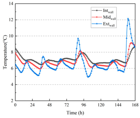 Figure 17 shows the temperature changes inside the compacted wall during the winter. The temperature fluctuation on the outer surface of the wall was significant. However, owing to the lower temperature in winter, the fluctuation was much smaller than that in summer, and the temperature fluctuations of the wall gradually leveled off from outside to inside. Except for the seventh day, the fluctuation was approximately 1 °C. The temperature fluctuation on the outer surface of the wall was significantly greater than that on the middle and inner surfaces of the wall, with the maximum fluctuation approaching 7 °C, indicating that the rammed-earth wall also had good thermal–buffering capacity in winter.