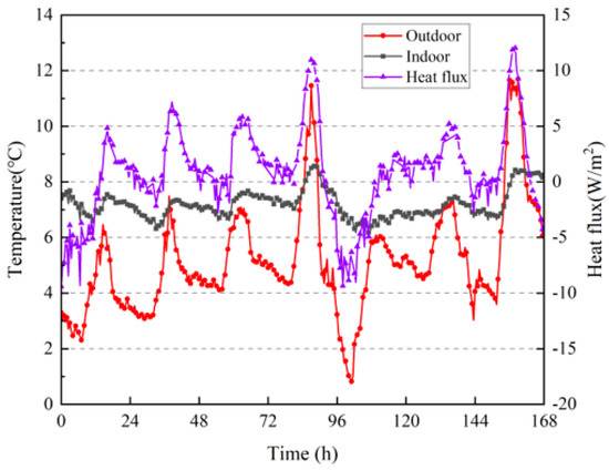 Because the energy performance of a building is difficult to quantify, as it depends on its inherent parameters as well as the living environment, this study investigated the energy transfer information of a building in terms of heat flux. Based on Equation (9), the heat flux of a rammed–earth wall can be calculated using test data, which was calculated as