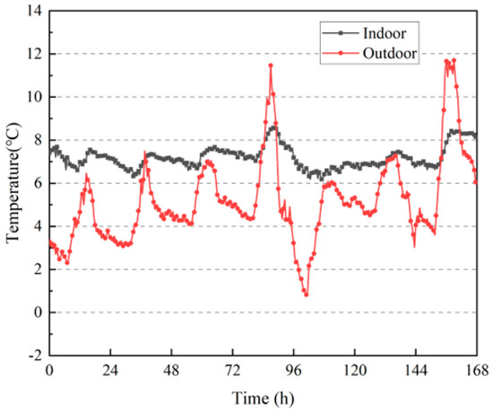 As shown in Figure 21, the outdoor temperature fluctuated widely and was lower than the indoor temperature most of the time, whereas the indoor temperature fluctuation of the rammed–earth building was more stable, and the indoor daily temperature fluctuation still did not exceed 2 °C when the outdoor daily temperature fluctuated up to 8 °C. The highest outdoor temperature was close to 12 °C, and the night temperature was as low as 1 °C, whereas the indoor temperature was always maintained between 6 °C and 9 °C, which indicated that the rammed–earth building also had good heat insulation and thermal stability in winter.
