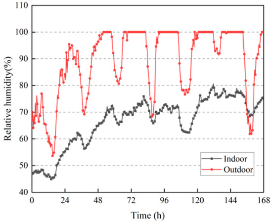 Figure 22 shows the changes in the indoor relative humidity of the building during the test period. It can be observed from the figure that the outdoor relative humidity fluctuated more, and most of the values were much higher than the indoor values. The overall indoor and outdoor relative humidity was also greater than that in summer; the outdoor relative humidity can reach up to 100%, and the indoor relative humidity can exceed 80% in winter. From the proportion of indoor and outdoor relative humidity periods in Figure 23, it can be observed that the indoor relative humidity was mostly between 60% and 80%, and the proportion of outdoor relative humidity periods greater than 80% was as high as 75.3%. This shows that the rammed–earth building has good humidity–buffering capacity, but the higher indoor and outdoor air relative humidity degrades the durability of the wall and indoor air quality, and can easily cause mold growth.
