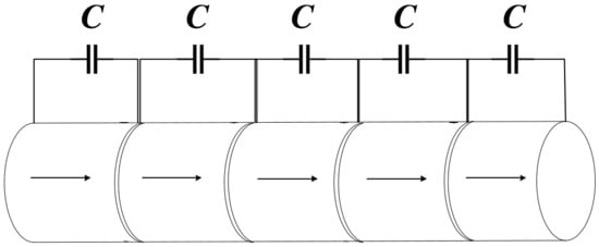 The analytical solution of the dispersion relation of the low-frequency symmetric Lamb wave of a piezoelectric plate with periodic strip electrodes can be obtained according to the piezoelectric plate theory and the assumption of a uniform distribution of the electric field between the upper and lower electrodes [105]. The resonant bandgap in the piezoelectric plate with simple external circuits can be estimated using equivalent circuits. The piezoelectric plate unit with the surface covered with electrodes can be considered an equivalent capacitor. The piezoelectric plate connected to the external circuit can be equivalent to a pure circuit. The approximate location of the resonant bandgap is predicted using the resonant frequency of the inductive capacitance circuit [26]. When the electrode length is less than the unit width of the piezoelectric plate, the equivalent capacitance of the piezoelectric plate can be obtained through numerical calculation or experiment.