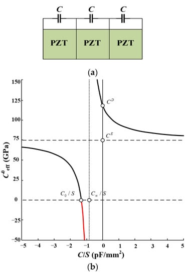 PZT periodically layered piezoelectric structure and the relationship between the parameters. (a) Structure of the piezoelectric PC; (b) dependence of the quasistatic effective elastic constant on the external capacitance C [30].
