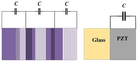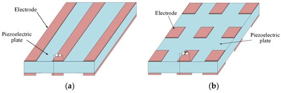 In summary, these two types of piezoelectric PCs generally use periodic electrodes to connect the piezoelectric material with external circuits. The bandgap is mainly generated via periodic electrical boundary conditions. With the increase in the dimensions of structures and the types of external circuits, the complexity and diversity of bandgaps are increasing. Studies on the coupling of piezoelectric PCs to complex external circuits are currently lacking. Some unique microstructures or related concepts such as resonance units have been introduced to promote an integrated design [37,38,39,40,41,42]. The topology optimization method was introduced into the design of piezoelectric PCs [43] to improve the acoustic characteristics of the structure. In addition, if the symmetry of the structure is broken, e.g., by modifying the electric field boundary conditions of the upper and lower electrodes and achieving the LRG against the Lamb wave mode, there may be a unique phenomenon.
