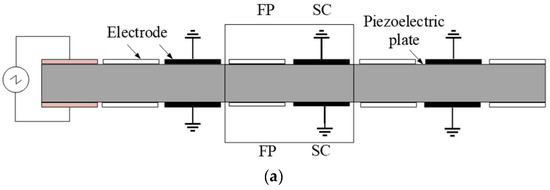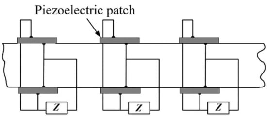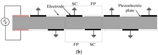 Compared with the piezoelectric PCs that use a single piezoelectric patch, the piezoelectric PCs using double piezoelectric patches are advantageous in tuning bandgaps. Piezoelectric parallel arrays are typical examples. They are powerful tools to change the equivalent mechanical impedance to control the dynamic fluctuation behavior by changing the tunable properties of parallel piezoelectric patches. Thorp et al. [53] controlled the propagation of longitudinal waves in a rod-like structure by periodically distributing parallel piezoelectric patches, as shown in Figure 9. They derived and calculated the equivalent Young’s modulus of the piezoelectric patches in the external circuit. This finding confirmed that the effect of the shunt circuit on the piezoelectric patch was to change the equivalent Young’s modulus, and this adjustment method could obtain a negative equivalent elastic modulus. Since then, several researchers, including Airoldi et al. [54], have also studied the propagation of waves in similar structures. However, 2D piezoelectric PCs have a higher dimension than the 1D structure, which introduces more vibration and wave modes. More novel, extraordinary, and unexpected vibrations and fluctuations have been discovered and studied. Chen et al. [55] proposed an effective method to predict the dispersion relationship of waves propagating in any direction of 2D piezoelectric PCs, and they studied the effects of damping and electrical resonance on the propagation of waves in all directions. Studies have demonstrated that the resistive shunt can adjust the position of the bandgap and attenuation constant. In addition, the internal resonance of the resonant shunt system splits the dispersion curve to form LRGs. LRGs in piezoelectric PCs have attracted the attention of researchers. Casadei et al. [56] demonstrated that connecting an array of active NC shunt circuits and a passive parallel resonant shunt circuit to different piezoelectric chip arrays can effectively widen the bandgap. Subsequently, Zhang et al. [57] constructed bandgaps based on a periodic array of piezoelectric patches based on mixed shunts. An active shunt circuit and a passive resonant shunt circuit are connected parallel to the same piezoelectric patch. Studies have shown that wider bandgaps can be obtained when LRGs are coupled to bandgaps.