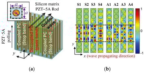 There is another composite piezoelectric PC where the piezoelectric material acts as a columnar scatterer. Oh et al. [34] found that active wave-guiding could be realized in a stop band frequency range of a phononic crystal (PC) if piezoelectric inclusions in the PC were electrically controlled. The PC structure considered in their work has PZT - 5A rods embedded in a bulk silicon matrix shown in Figure 7a, and Figure 7b shows the mode shapes of the guided modes for the frequency range corresponding to the stop band of the coupled PC. The feasibility of this structure was confirmed using the finite element method (FEM). The propagation mechanism of the incident plane wave in the waveguide was explained using SL dispersion and wave pattern analysis. Then, Hu et al. [35] designed a 2D piezoelectric crystal structure that consisted of a square piezoelectric rod embedded in an epoxy resin matrix, where the inductor circuit independently controlled the performance of the unit. By appropriately selecting external circuit parameters, LR can be combined with complete Bragg scattering. By adjusting the L of the external circuit, the appropriate operating frequency range can be selected. This structure can be used to simultaneously suppress vibrations and harvest energy. Dwivedi et al. [36] discovered that the bandgap characteristics of piezoelectric PC with negative stiffness depended on the dimensionless capacitance (C) and resistance (R) parameters.