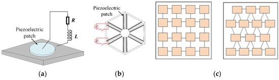 The passive control strategy has the advantages of low energy consumption, strong stability, and low cost. The performance of a passive control system is affected by its mechanical characteristics and external circuits. The external circuit determines the mode of power transmission and dissipation. Therefore, the design of piezoelectric parallel damping circuits will significantly affect the control effect of the structure [74,75]. Shunt circuits that do not require an external power supply (such as an R shunt circuit) are called passive circuits. Circuits that require an external power supply but do not provide any power to a mechanical structure (such as synchronized switch damping shunt circuits) are called semi-passive circuits. The R shunt circuit converts the mechanical vibration of the piezoelectric material into electrical energy in the circuit, and some of the energy is dissipated in the form of thermal energy. The resonant single-mode shunt circuit consists of resistors and inductors in series or parallel. If the circuit’s resonance is equal to that of the mechanical system, the structure exhibits a resonant behavior. This resonance characteristic causes a bandgap and will generate considerable control forces to resist the vibration of the mechanical system. Passive RL shunt circuitry can be applied to suppress the vibration of shell plates in the tunable LRG [76,77,78,79]. Nevertheless, the LRG produced by the passive RL circuitry technology is mostly narrow in piezoelectric PCs. In contrast, resonant multi-mode shunt circuits [68] can tune mechanical vibrations in more frequency bands.