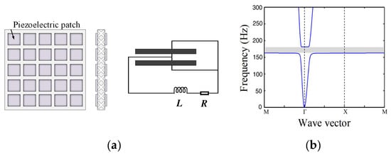 Schematics of (a) the piezoelectric PC with compact piezoelectric parallel array and (b) dispersion curves. Reprinted with permission from Ref. [58]. 2016, Chen, S.