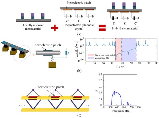 Hybrid metamaterials: (a) adaptive hybrid metamaterial, (b) a finite hybrid piezoelectric phononic crystal beam and FRF, and (c) the hybrid composite beam metamaterial and the attenuation diagrams [61,62,65]. Reprinted with permission from Ref. [61]. 2017, Chen, Y. Reprinted with permission from Ref. [62]. 2018, Sugino, C. Reprinted with permission from Ref. [65]. 2022, Li, J.