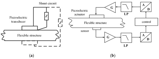 Piezoelectric materials have been used as physical components for passive and active control systems in piezoelectric PCs to control bandgaps. Figure 14 shows their working block diagram [66]. In a passive control system, piezoelectric plates are bonded to the surface of the vibration structure as active components of inertial actuators. This includes connecting a circuit or an electronic circuit (represented by impedance Z in Figure 14a to an electrode of a piezoelectric transducer connected to the vibrating structure. Thus, the mechanical energy generated by the vibration is converted into electrical energy according to the direct piezoelectric effect, which is transmitted to the circuit and partially dissipated. The external circuits of the passive control strategy include passive, semi-passive, and semi-active circuits. In the active control system, piezoelectric sheets are used as sensors or actuators to control the mechanical vibration or fluctuation characteristics of elastic structures. The external circuits consist of charge amplifiers (G), filters (LP), and converters (A/D). The diagrams and features of relevant circuits included in these two systems are summarized in Table 1.