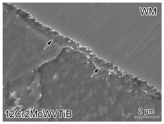12Cr2MoWVTiB BM in the DMW after PWHT was etched by the solution containing nitric acid, and then the Ni/Fe interface between WM and BM was observed. Figure 5 shows the microstructures near the interface. There was still a layered microstructure at the interface, as marked by the black arrows in Figure 5. It is worth noting that lath-shaped substructures were present in the layered microstructure in the DMW after PWHT, which was different from the layer (see Figure 2) in the as-welded DMW. The results of morphological observation implied that the layered microstructure in the DMW after PWHT seemed to be tempered martensite.