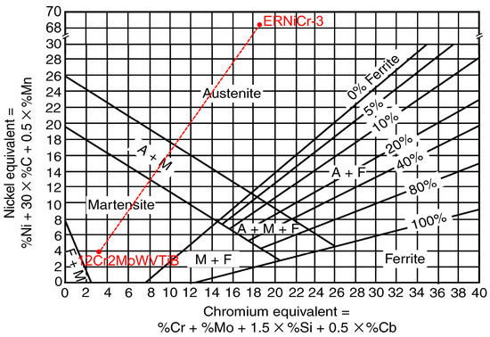 To clarify the type of layer at the interface, a Schaeffler diagram was used for reference. A Schaeffler diagram can be used to preliminarily predict the microstructure in welds of alloy steels and stainless steels by means of arc welding. The chemical compositions of WM and ferritic BM were converted into chromium equivalents (Creq) and nickel equivalents (Nieq) according to Equations (1) and (2), marked in the Schaeffler diagram as the horizontal and vertical axes, as shown in the red points in Figure 4. The chemical composition of the PMZ transformed from that of BM to that of WM. The dotted line connecting the two red points in Figure 4 expressed the change in Creq and Nieq in the PMZ. The dotted line could only traverse through martensitic and austenitic regions, but not through ferritic regions. Therefore, the possibility that the BCC layer at the interface after welding was ferrite could be excluded. Meanwhile, it could be inferred that the BCC layer was martensite formed in the PMZ.