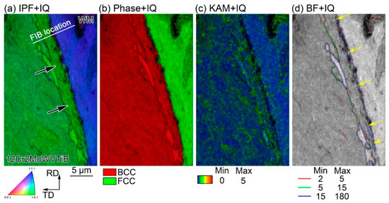 In addition, EBSD was performed on the Ni/Fe interface in the DMW after PWHT, as shown in Figure 6. There was still a layered structure between 12Cr2MoWVTiB BM and WM, as marked by the black arrows in Figure 6a. The layered microstructure had a BCC structure (see phase + IQ map in Figure 6b). Meanwhile, the KAM map was used to semi-quantitatively reveal the dislocation density distribution, as shown in Figure 6c. The dislocation density of the layered microstructure was still high. Specifically, the BF + IQ map showed a band of finer structures with large angle grain boundaries in the layered microstructure connected to the WM, as indicated by the yellow arrows in Figure 6d. These finer microstructures were newly formed during the PWHT process, not the welding process. A martensite layer with a width of 1 to 3 μm along the WM/ferritic steel interface was reported in a DMW after PWHT in the literature [2], but the finer microstructures similar to those shown in Figure 6d was not mentioned.