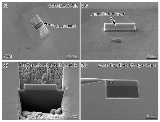 In addition to the layered microstructure, finer structures appeared along the interface after PWHT. Thus, it was necessary to characterize the interfacial microstructures and chemical composition in more detail. FIB was employed to accurately extract the interfacial sample in the DMW after PWHT for TEM observation. The position marked by the white line in Figure 6a indicates the FIB location. Figure 7 shows the preparation process for the FIB sample. Since the interfacial regions contained three different microstructures, namely 12Cr2MoWVTiB steel, layered microstructure, and nickel-based WM, the hardness gradient made the thinning process difficult during preparation of the TEM sample. Therefore, only part of the final sample prepared by FIB could be used for TEM observation.