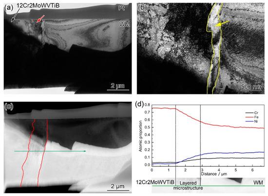 Figure 8 shows the TEM and EDX results for the interfacial microstructures. Figure 8a clearly displays the layered structure with a width of ~1 μm between 12Cr2MoWVTiB steel and WM (marked by the red arrow in Figure 8a). It is worth noting that there was a band of bright white microstructures with a width of ~200 nm on the right side of the layered microstructure, as marked by the yellow arrow in Figure 8b. K. Y. Shin et al. [31] conducted TEM observational analysis of the nickel-based WM/P92 interface, but did not note the above ~200 nm microstructure. This new microstructure had not been reported, so further analysis was warranted. Figure 8c shows the HAADF image corresponding to Figure 8a, and the layered structure along the interface could also be clearly observed, as outlined by the red line. Figure 8d shows the EDX line-scanning results across the interface, which revealed the chemical composition change. There was a chemical composition gradient inside the layered microstructures.