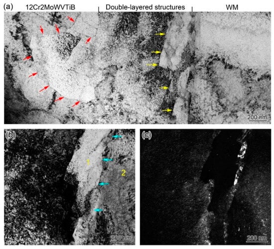 Figure 9 shows the detailed results of the TEM observation of the interfacial microstructures in the DMW after PWHT. The equiaxed grains in the 12Cr2MoWVTiB matrix could be clearly observed on the left side of the layered microstructure, and the red arrows marked in Figure 9a indicate their grain boundaries. Furthermore, the band of finer structures adjacent to WM was clearly displayed. There was a boundary between the layered microstructure and the finer microstructures, as indicated by the yellow arrows in Figure 9a. Detailed bright-field and dark-field TEM images in a region of interest in Figure 9a are shown in Figure 9b,c. The above morphological results by TEM observation suggested the layered microstructure and the finer microstructures were not the same type.