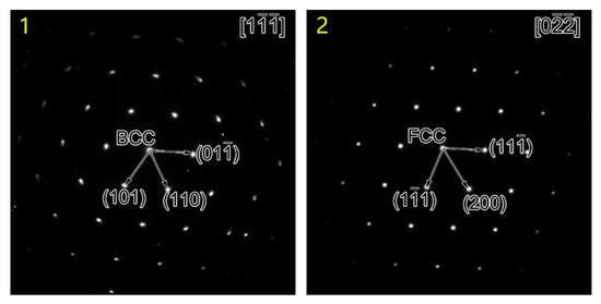 In addition, SAED was performed on the band of finer microstructures (position 1 in Figure 9b) and its adjacent microstructure (position 2 in Figure 9b), and the results are shown in Figure 10. The band of finer microstructures (position 1 in Figure 9b) was BCC and its adjacent microstructure (position 2 in Figure 9b) was FCC, which indicated that the microstructure on the right side of the band of finer microstructures was already WM. There was a clear boundary between the band of finer microstructures and WM, as marked by the blue arrows in Figure 9b. Figure 9c shows a dark-field TEM image corresponding to Figure 9b. Importantly, there were no substructures in the interior of the band of finer microstructures. The band of finer microstructures observed by TEM corresponded to the finer structures along the interface observed by EBSD (marked by the yellow arrows in Figure 6d). According to the experimental results, it could be speculated that the band of finer microstructures with a width of ~200 nm was likely to be quenched martensite newly formed in the PWHT process.