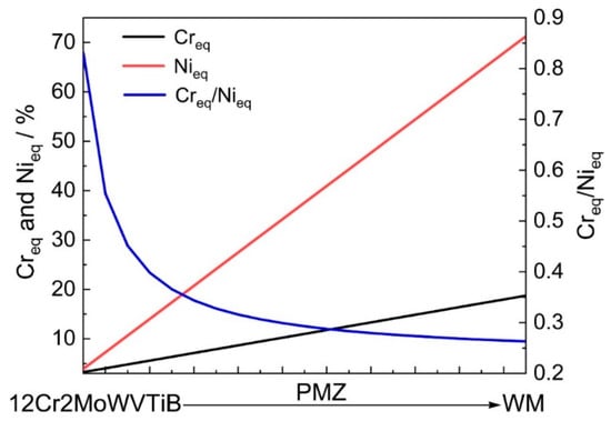 Change trends of Creq and Nieq in the PMZ between 12Cr2MoWVTiB BM and nickel-based WM.