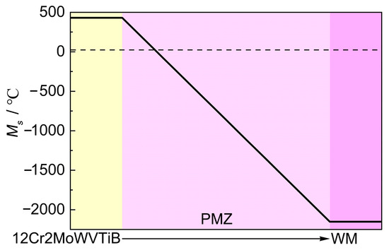 Furthermore, the solid phase transformation in the PMZ was analyzed. The chemical composition in the PMZ gradually changed from BM to WM, and thus the transformation of austenite in the PMZ after solidification to martensite could be considered during the subsequent cooling process. The chemical compositions of 12Cr2MoWVTiB steel and filler metal were taken as the endpoints of the chemical composition of the PMZ and the contents of each element made a linear transition. Then, Ms in the PMZ was calculated according to Equation (3) and the result is shown in Figure 13. From the BM side to the WM side, Ms in the PMZ rapidly decreased to below room temperature, but theoretically there would be a narrow region adjacent to BM where Ms was above room temperature, as shown in Figure 13. This meant that austenite in this region could transform into martensite during cooling to room temperature. Combining the experimental results in Section 3.2 with the above theoretical analysis indicated that the layer at the interface after welding was martensite.