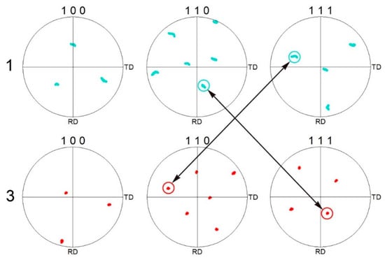 In addition, the orientation relationship between the martensite layer at the interface (position 1 in Figure 3a) and its adjacent FCC PMZ (position 3 in Figure 3a) was revealed by PF maps using EBSD technology, as shown in Figure 14. The martensite layer after welding and its adjacent FCC PMZ followed the K–S relationship [34,35]. This meant that during the cooling process, when position 1 was austenite, position 3 was also austenite. Positions 1 and 3 belonged to the same prior austenite grain. The high Ni content in position 3 improved austenite stability, and the microstructure at position 3 was still austenite after cooling to room temperature. The low Ni content in position 1 was insufficient to preserve the austenite to room temperature; thus, the austenite transformed into interfacial martensite. The above viewpoint was proven by the experimental evidence that positions 1 and 3 maintained the K–S relationship. The solidification and solid phase transformation in the PMZ during welding were clarified.