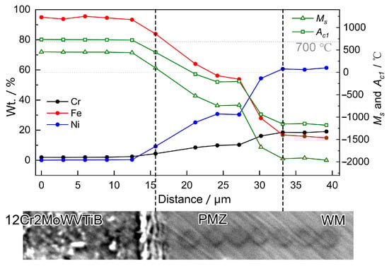 Furthermore, point-by-point EPMA was performed to obtain the chemical composition change across the interface, as shown in Figure 15. The spacing between two EPMA points was 3 μm. The EPMA quantitative results were used to calculate Ac1 and Ms. From the 12Cr2MoWVTiB steel side to the WM side, Ac1 and Ms decreased rapidly in the PMZ due to the increased Ni content. The chemical composition of the interfacial martensite layer transitioned continuously from that of 12Cr2MoWVTiB steel to that of FCC PMZ. Ac1 of the interfacial martensite layer adjacent to 12Cr2MoWVTiB steel was higher than 700 °C, which indicated that austenization would not occur in the above microstructure during the PWHT process. Ac1 of the interfacial martensite layer adjacent to FCC PMZ was obviously lower than 700 °C and Ms was also above room temperature, which meant that the microstructures in this region would be re-austenized during the PWHT process and could be transformed into quenched martensite during the subsequent cooling process. Therefore, finer quenched martensite was newly formed in the region adjacent to FCC PMZ after PWHT.