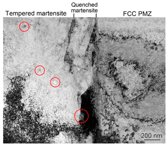 In addition, carbides were formed at the Ni/Fe interface after PWHT, as shown in Figure 17. A few carbides were observed in the interior of the tempered martensite layer and at the interface between the tempered and quenched martensite, as marked by red circles in Figure 17. The interfacial carbides did not grow and coarsen during PWHT, and their average size was only 40 nm, which was related to the short time of the PWHT.