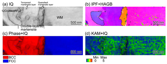 TKD results at the Ni/Fe interface in the DMW after PWHT: (a) IQ map; (b) IPF + high angle grain boundary (HAGB) map; (c) phase + IQ map; (d) KAM + IQ map. The step size for TKD was 20 nm.