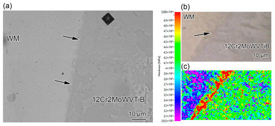 Inhomogeneity of microstructure and hardness of the Ni/Fe interface between nickel-based WM and 12Cr2MoWVTiB steel after PWHT: (a) OM image of the sample prepared by ion beam polishing; (b) rested area of nanoindentation; (c) hardness distribution map.