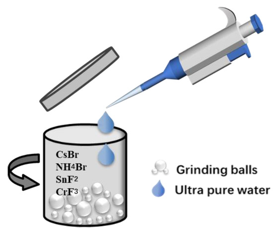 Cs4SnBr6−xFx samples were procured through a water-assisted wet ball-milling procedure. The reactant precursors employed were cesium bromide (4 mmol, CsBr, Aladdin, 99.9%), stannous fluoride (1 mmol, SnF2, Macklin, 99.9%), and ammonium bromide (1 mmol, NH4Br, Aladdin, 99.99%). To derive Cr3+-doped Cs4SnBr6−xFx with varying concentrations, the molar ratios of CsBr, SnF2, and NH4Br were retained at 4 mmol, 1 mmol, and 2 mmol, respectively, while the molar ratio of CrF3 was set at 0 mmol, 0.05 mmol, 0.1 mmol, 0.3 mmol, and 0.5 mmol, correspondingly. The precursor blend was initially placed in a jar and amalgamated with 60 μL of deionized water, followed by ball milling for 30 min at 600 rpm. The material was then dried in a vacuum oven for 60 min at 60 °C. After cooling to ambient temperature, the Cr3+-doped Cs4SnBr6−xFx powder was procured by conducting ball milling for an additional 30 min at 600 rpm. Figure 1 depicts the synthesis process of Cr3+-doped Cs4SnBr6−xFx through water-assisted ball-milling at room temperature. For PL measurement, the power samples were carefully transferred into the well of the FLS1000 solid sample holder (Livingstone, UK). The PL characteristics were evaluated using an Edinburgh Instrument FLS1000 PL spectrometer (Livingstone, UK). The PL was excited at an angle of 30 degrees relative to the surface of the samples and was collected at an angle of 60 degrees to the surface. Time-resolved PL spectra and PL excitation (PLE) spectra were also documented utilizing the same instrument. The crystallographic structures of Cs4SnBr6−xFx were analyzed via X-ray diffraction (XRD) with a Bruker D8 Advance instrument (Karlsruhe, Germany). XRD examinations were performed at 35 kV and 35 mA to determine the samples’ crystal structure. The compositional analysis of Cs4SnBr6−xFx was achieved via energy dispersive spectroscopy (EDS) utilizing a Bruker EDS QUANTAX system (Karlsruhe, Germany). The surface morphology and microstructure of Cs4SnBr6 were explored using scanning electron microscopy (SEM) implemented on a Hitachi SU5000 SEM instrument (Tokyo, Japan).
