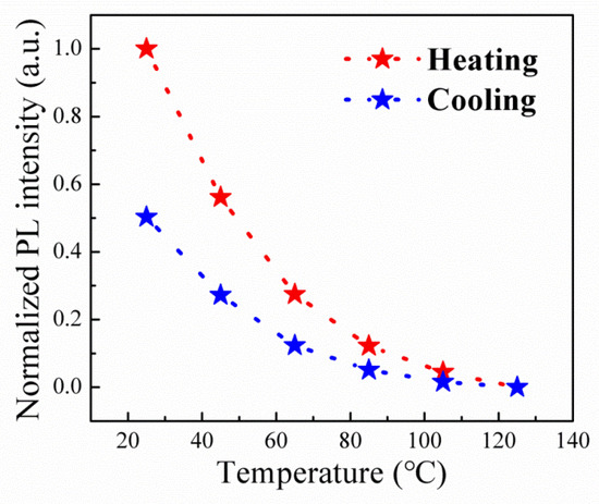 To scrutinize the thermal resilience of the Cr3+-doped samples, the integrated PL intensities, as a function of temperature, were systematically tracked through successive heating and cooling cycles. As portrayed in Figure 11, an observable thermal quenching of PL is experienced by the Cr3+-doped sample as the temperatures escalated from 25 to 165 °C. Following these heating and cooling cycles, the PL intensity exhibits a reduction of approximately 50%. In stark contrast, the pure Cs4SnBr6 perovskite underwent a PL intensity reduction exceeding 90% post the identical thermal cycles [18]. Evidently, the Cr3+-doped Cs4SnBr6−xFx perovskite manifests enhanced thermal and structural sturdiness in comparison to its pure Cs4SnBr6 perovskite counterpart.