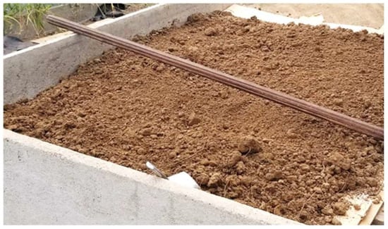 The soil used for the plant-growing experiment was collected from an area located near Ghent, Belgium, and had never been treated with animal manure. The soil (Figure 3) was characterized by a loamy–sandy texture and was prone to high water accumulation and clumping into larger aggregates. It was typical soil for Belgium [16].