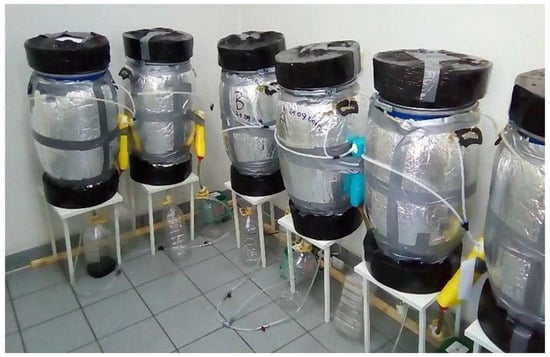 The laboratory composting setup (Figure 6) consisted of the insulated laboratory composting reactors with 60 L of volume each, the forced aeration system with the oxygen flow regulators, the temperature probe, and the containers for collecting leachate and condensate, which also served as the system for capturing gases from the outlet air, i.e., NH3 and CO2. The leachate and condensate were collected but not used for further experiments due to insufficient quantities [19,34].