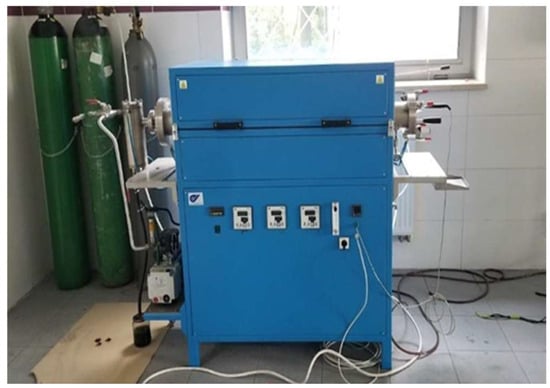 The laboratory biochar production setup (Figure 7) was able to reach a maximum temperature of up to 1100 °C. The pyrolysis reactor (PRWS100x780/11; manufactured by the Czylok company from Jastrzębie-Zdrój, Poland) had the ability to select the temperature and amount of nitrogen relative to the substrate used.