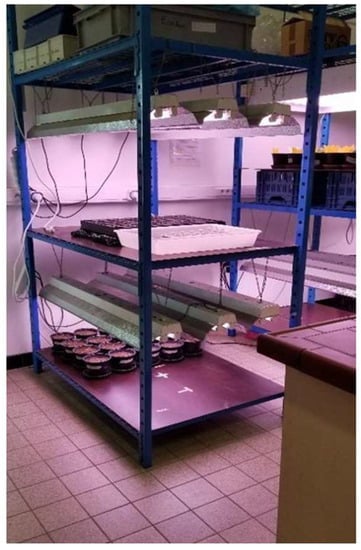 The plant growth experiment was conducted in a phytotron chamber. The chamber had a controlled temperature and artificial lighting. The plants were exposed to light for 16 h per day, as recommended in the literature to avoid the stress of insufficient light [36]. The specification of the lamps was as follows: Sylvania gro-lux f36W/gro t8 bulbs of 8500 K, 1200 mm long, and 28 mm wide (Figure 8). Light distribution on the shelves was controlled using a Quantum Model MQ-500 m with a separate sensor.