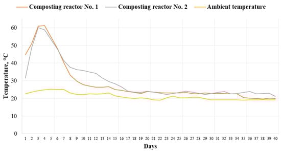 The temperature during the 40-day composting process was measured daily. During the composting process, a maximum value of 61.2 °C was observed in composting reactor No. 1 and 60.1 °C in composting reactor No. 2. The maximum temperature values were observed on the 3rd and 4th day of the composting trial, which is typical for proper composting. For example, Czekała et al. (2016) and Dróżdż et al. (2020) observed the maximum increase in the temperature during the first 5 days from the start of composting [19,34]. Figure 9 presents the temperature evolution during the 40-day composting process.