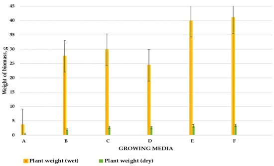 It can also be observed that the biomass of plants (aboveground part) from growing media B, C, D, E, and F presented higher N content than the biomass of plants from growing medium A (soil only). However, the biomass of plants from growing media B, C, D, E, and F contained less Ca, Mg, Na, and K than plants from growing medium A. This relation can be due to the fact—according to Feng et al. (2020)—that plants absorbing nitrogen from soil low in this compound accumulate more nitrogen in their roots, while Ca, Mg, and Na ions are accumulated in plant biomass [77].
