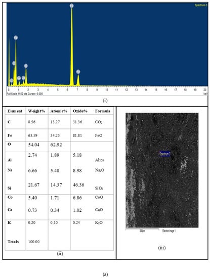 Distribution of elements after heat treatment with EDS analysis of X-rays using SEM. (i) EDX spectra of the sample. (ii) Table EDS analysis of inclusions from Figure (iii). (iii) Complex inclusions in the sample of NOES sheet containing w% Co. (a) The containing Co 5.40 w%. (b) The containing Co 32.93 w%. (c) The containing Co 72.33 w%.