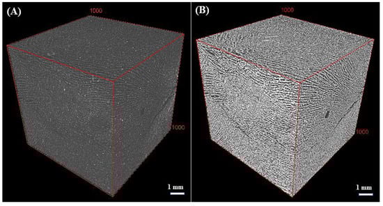 The samples underwent characterization using X-ray CT and image analysis to analyze their microstructure and quantify the porosity and volume fraction of each component. The X-ray CT scans were conducted at INSA Lyon, France, using a laboratory X-ray scanner. The data acquisition system recorded a total of 1120 projections, evenly distributed over a 360° rotation along the vertical axis of the sample. To obtain the 3D reconstructions, the recorded projections were processed using Xact software (http://xactsoftware.co.in/ accessed on 5 September 2023).