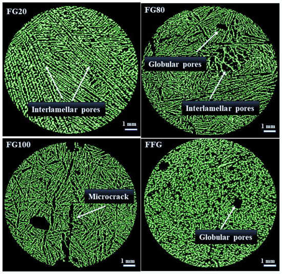 Figure 3 shows the microstructure of the samples obtained from X-ray CT images with a voxel size of 8 µm. The porosity network within flaxseed-gum-filled epoxy composites, encompassing different ratios of flaxseed gum/epoxy, highlights the presence of three distinct types of pores: (i) inter-lamellar pores separating two adjacent lamellae, with an average distance ranging from 2 to 300 µm; (ii) spherical and sub-spherical globular pores resulting from air trapped in the matrix during the fabrication process, which have an average maximum diameter of 1500 µm; and (iii) microcracks that developed due to the thermal stresses during the freezing process, with an orientation identical to that of the inter-lamellar pores.